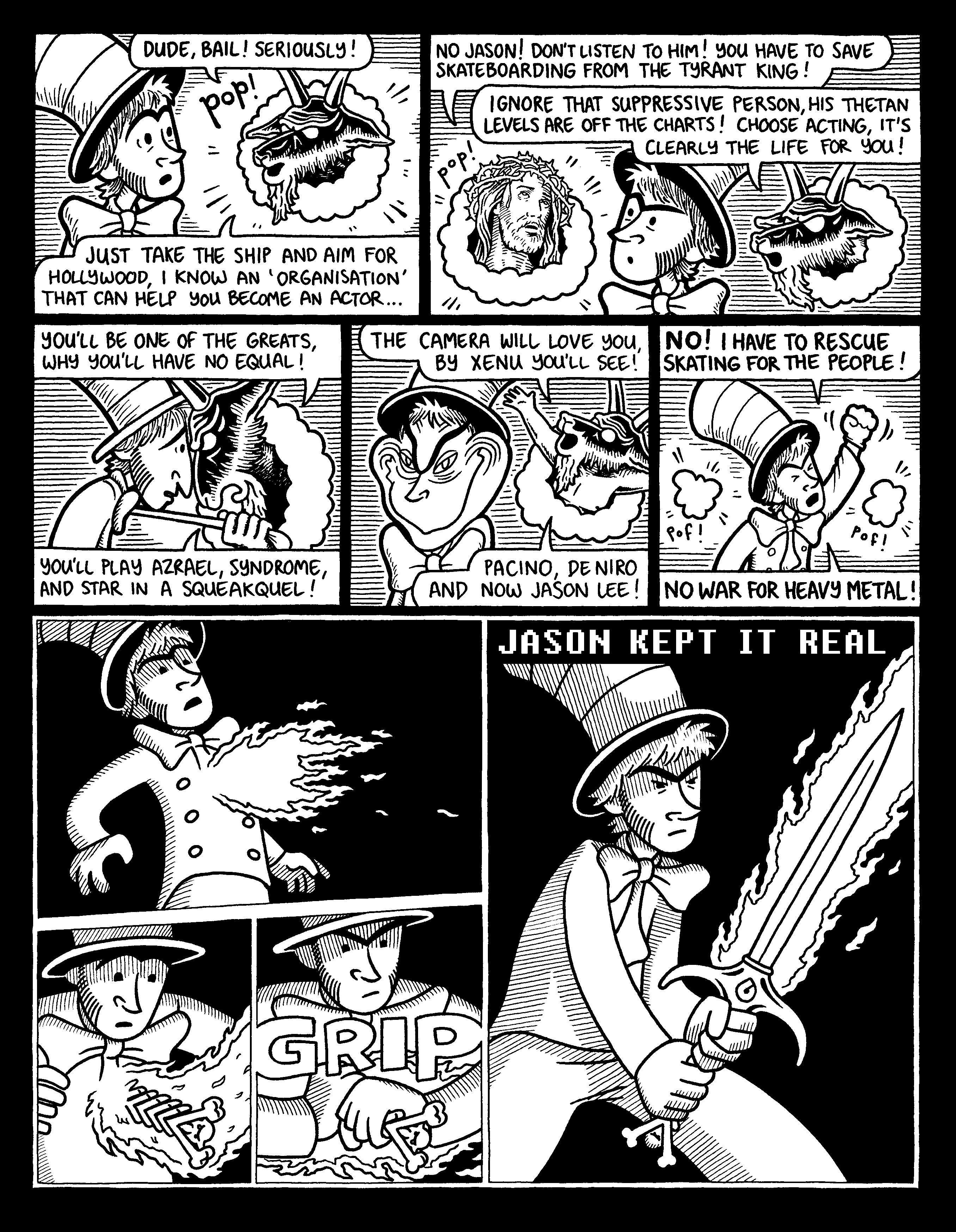 Jon Horner, one of skateboarding’s most prolific illustrators, dreamt up this incredible comic depicting the late ’80s big brand exodus when skaters like Mark Gonzales left Vision and founded Blind skateboards with Steve Rocco, bringing along Jason Lee and others.
